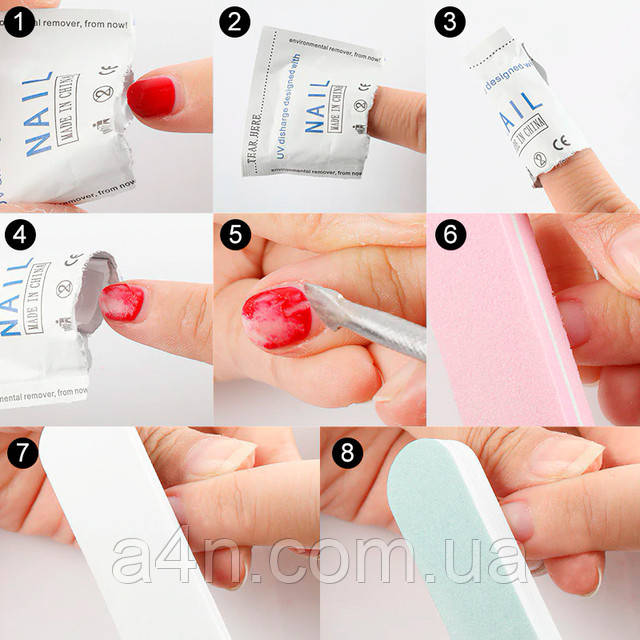 Серветки знаходяться у індивідуальних упаковках. Це забезпечує гігієнічність та зручність у використанні. З таким набором зняття покриття стане значно швидшим і простішим.