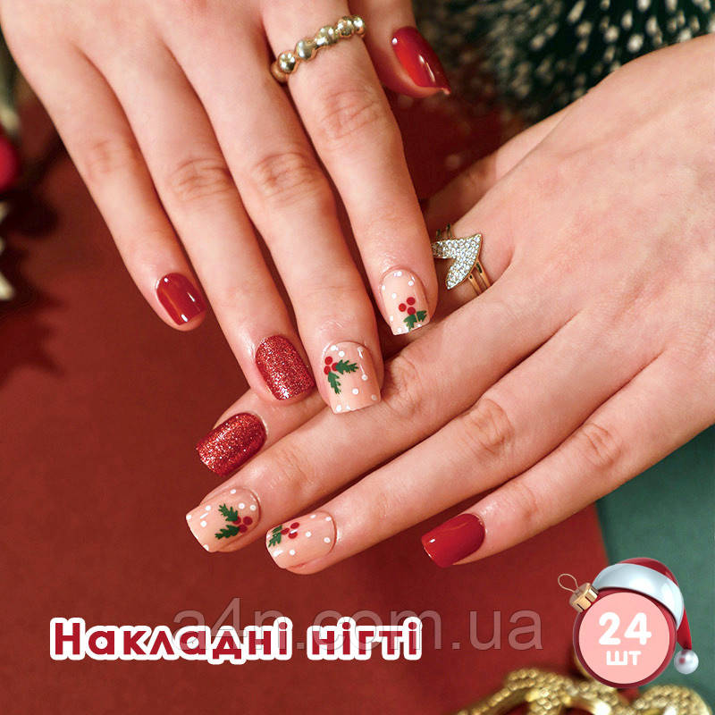 -10%Новорічні накладні нігті 24 шт. + клей для нігтів, форма-овал для манікюру - Різдвяні